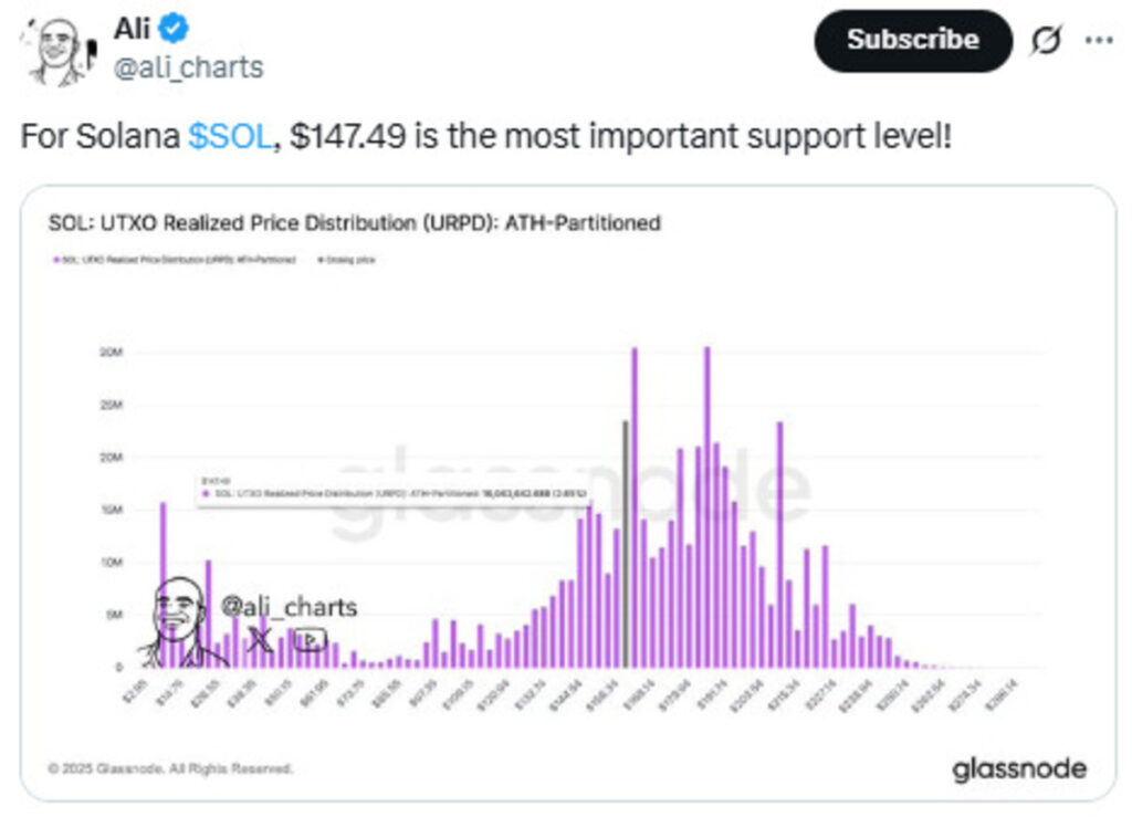 Crypto analyst Ali, sharing market insight from Glassnode on X, believes $147.49 is the most important support level for the Solana coin. Maintaining this support sets the stage for a significant leap, potentially retesting or breaking out above its January all-time high of $294.