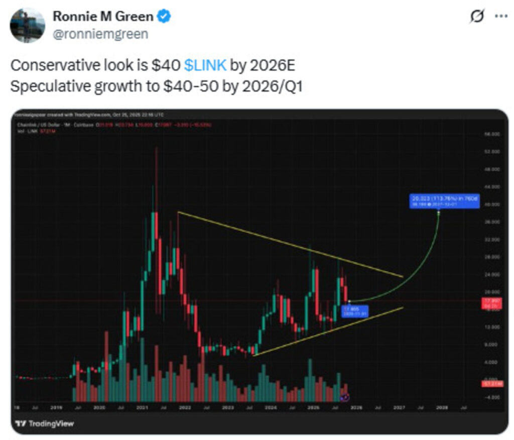 Ronnie Green, a crypto analyst, sets a conservative LINK crypto price target of $40 by 2026. At its current price, it is a high-potential altcoin worth betting on, driving significant whale demand and interest.