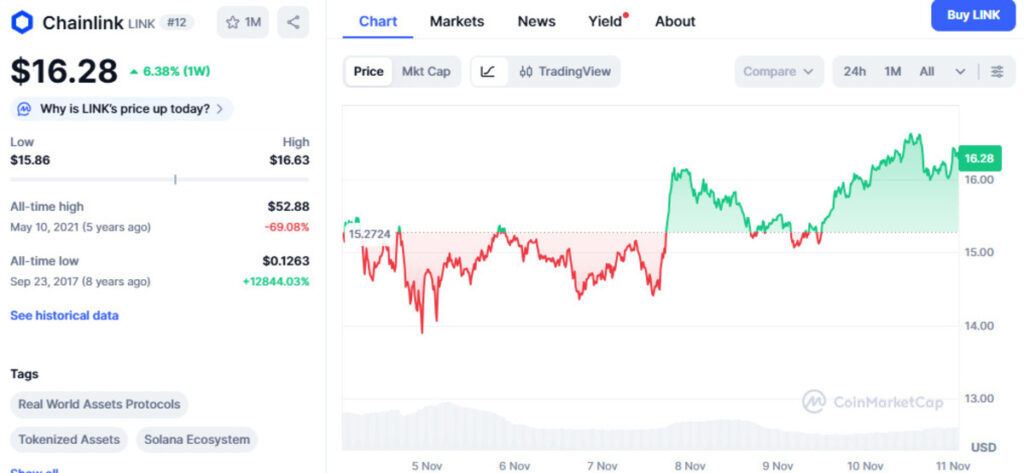 The LINK crypto witnessed a 6% rally over the past seven days, pushing the price above $16. With an uptrend unfolding on its daily chart, further gains are underway, making it a top crypto to buy now.
