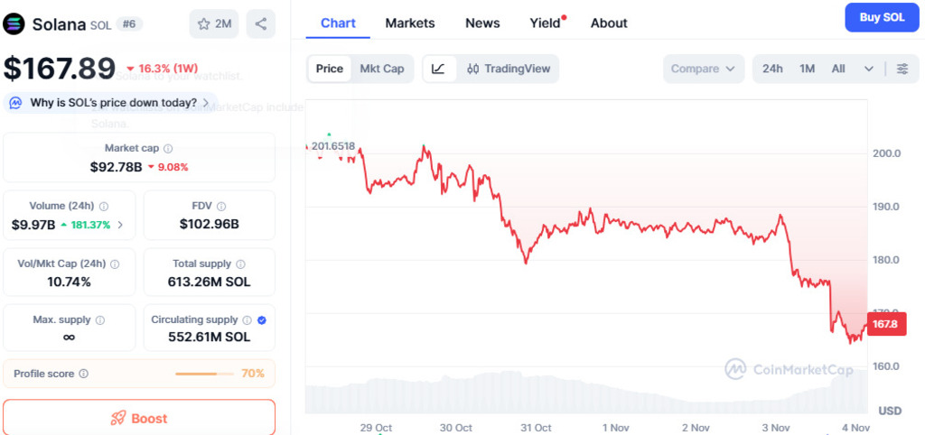 The Solana coin is currently in an attractive buy zone following the latest market pullback. A 16% weekly decline pushed it below the $170 mark, although a reversal is on the cards.