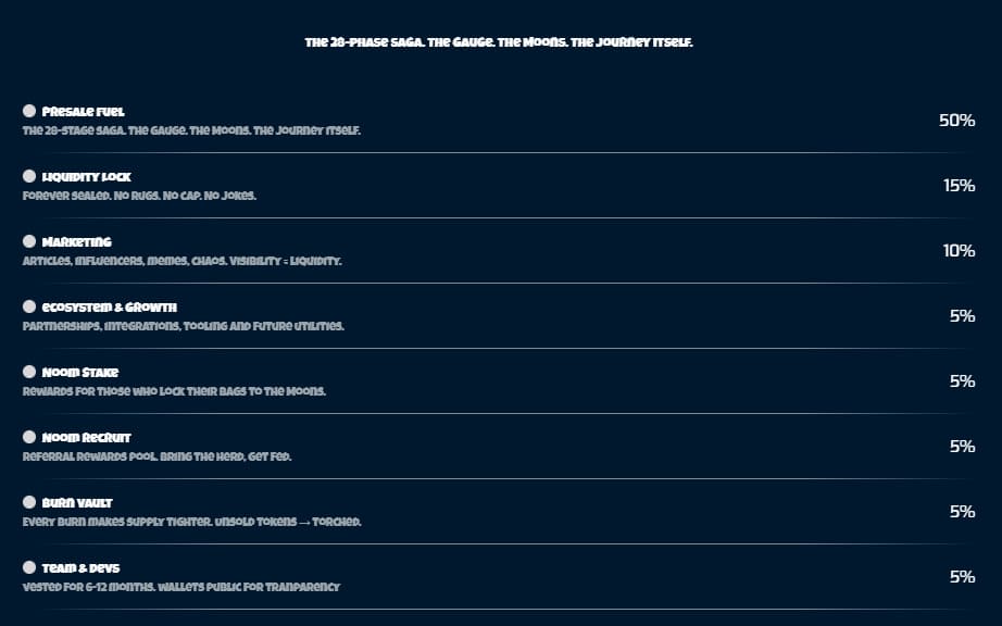 - The Noom Gauge shows live data on funds raised, holders, and burns.
