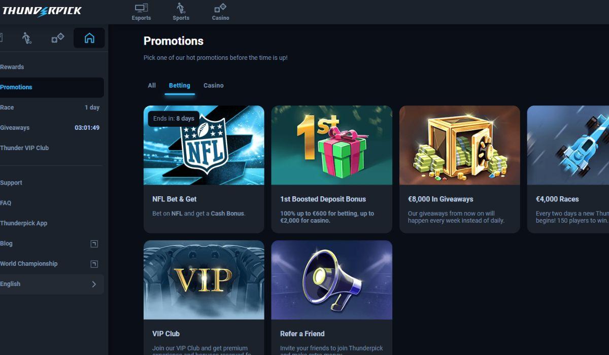 - NFL Bet & Get: A sport-specific promotion offering a Cash Bonus (€5) for betting on the NFL.