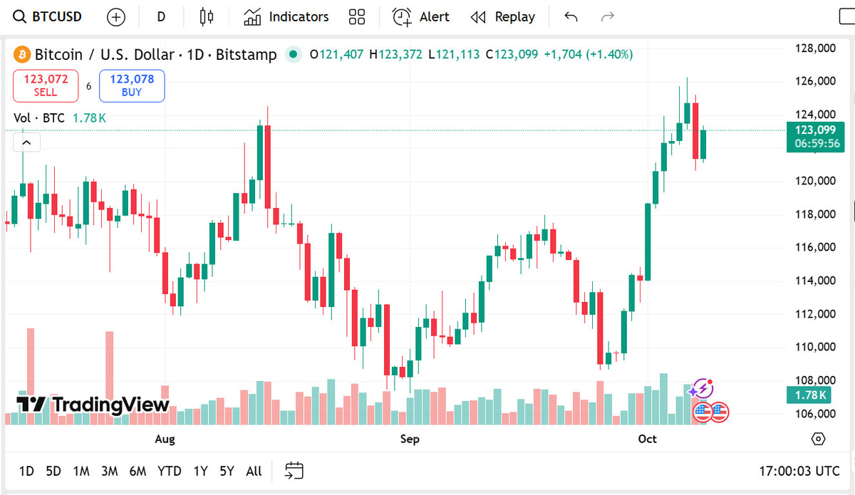 At the time of writing, Bitcoin is trading around $123,072, down about 1.05% over the past 24 hours. Reported 24-hour trading volume is about $83.41 billion, up roughly 18.97% over the same period.