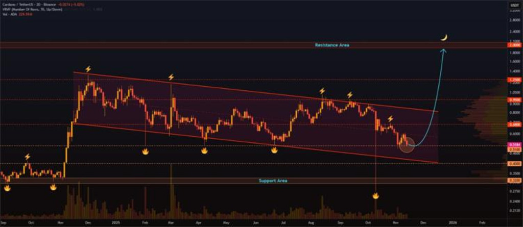 Cardano changes hands at $0.51, testing critical support. Early signs on the 2-day chart indicate buyers are stepping back into the market. For now, this level is proving resilient, and if held, Cardano may see a strong reversal, targeting higher levels such as $0.68, $0.95, $1.25, and possibly even $2.00. As ADA tries to make its move again, investors are also looking at Mutuum Finance for its innovative lending model, with a rapidly progressing presale.