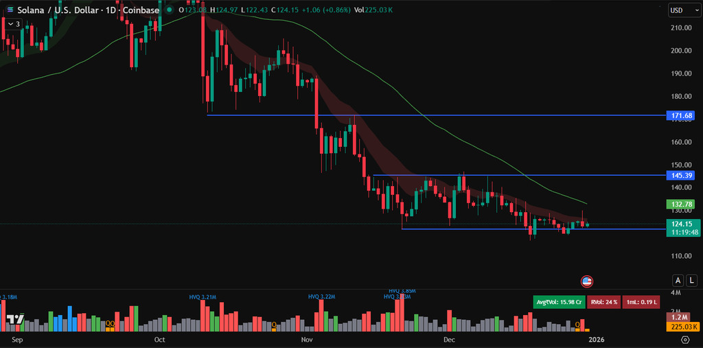 Solana has spent recent weeks trading above the $120 psychological support level, a zone that has repeatedly attracted buyer interest. This area now represents a key decision point for price direction.