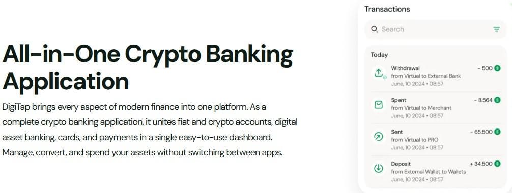 Digitap takes a wider view of how individuals interact with money on a daily basis. Rather than focusing on a single transaction type, the platform positions itself as an omni-banking application where users can manage multiple aspects of their financial activity. Within a single app, users can hold fiat balances, manage cryptocurrencies, receive funds, make payments, and spend via an integrated Visa card.