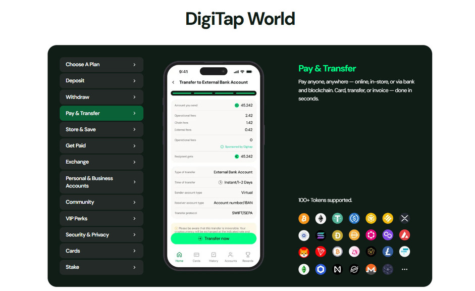 Digitap aims to streamline cross-border payments by connecting blockchain settlement with established banking rails such as SWIFT, SEPA, ACH, and Faster Payments. The platform is already live, allowing users to hold digital assets, transfer funds internationally, and spend through Visa-supported mechanisms within one application.