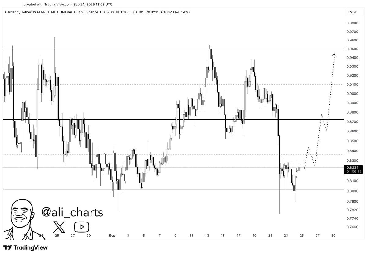 According to Ali Martinez’s ADA price prediction, he stated that as long as Cardano ($ADA) holds $0.80, a rebound to $0.95 remains on the table.Ā