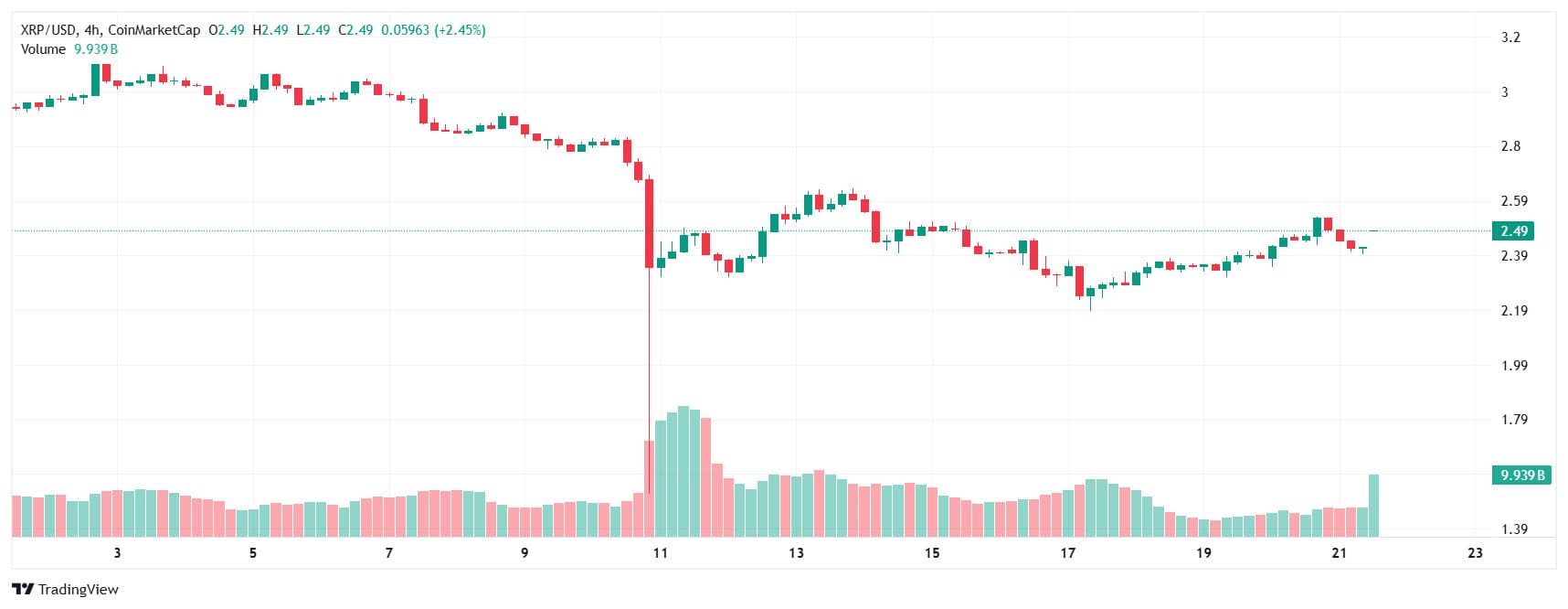 XRP has been fighting to recover after weeks of heavy selling. The token trades near $2.46, up slightly from recent lows. Still, it remains almost 18% down over the past month.