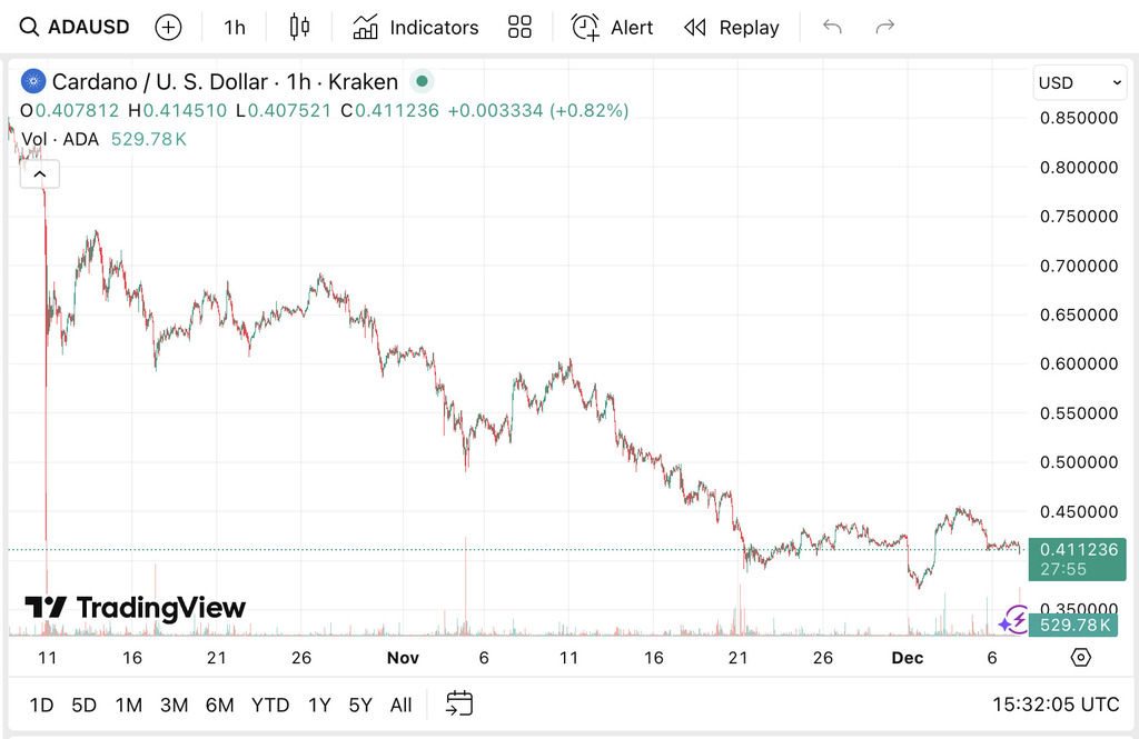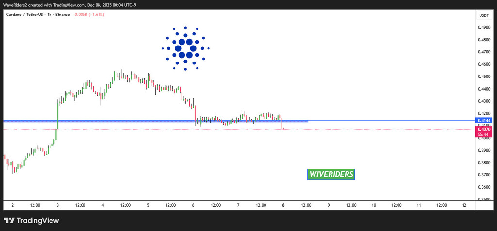 Cardano is currently selling at $0.4109, down 0.97%, with a market cap of $14.75B and trading volume at $437.95M, down 2.56%. A recent update from analysts noted that ADA has now broken below a major support zone, indicating that sellers have taken control of the structure.Ā