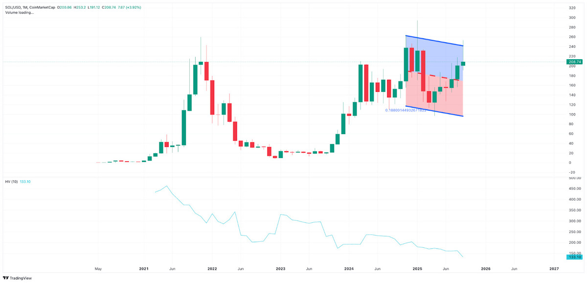 Solana’s price history tells a powerful story. After bottoming in late 2022 near $8, it rose sharply to the $250 region over the next 18 months. But according to the monthly chart, SOL has now formed a clear falling wedge.
