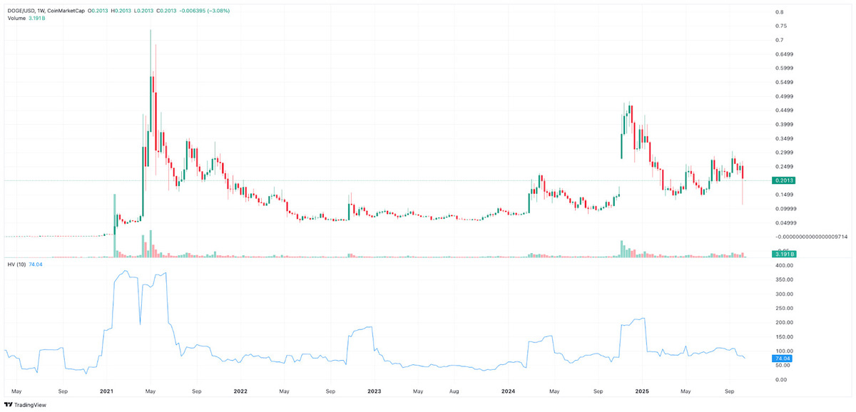 Dogecoin’s case is even clearer. The weekly chart shows a long decline in volatility since its massive 2021 rally. After touching highs near $0.70, DOGE has been stuck under $0.25 for over a year. Spikes in volume have failed to push the price meaningfully higher, and the trend remains sideways.