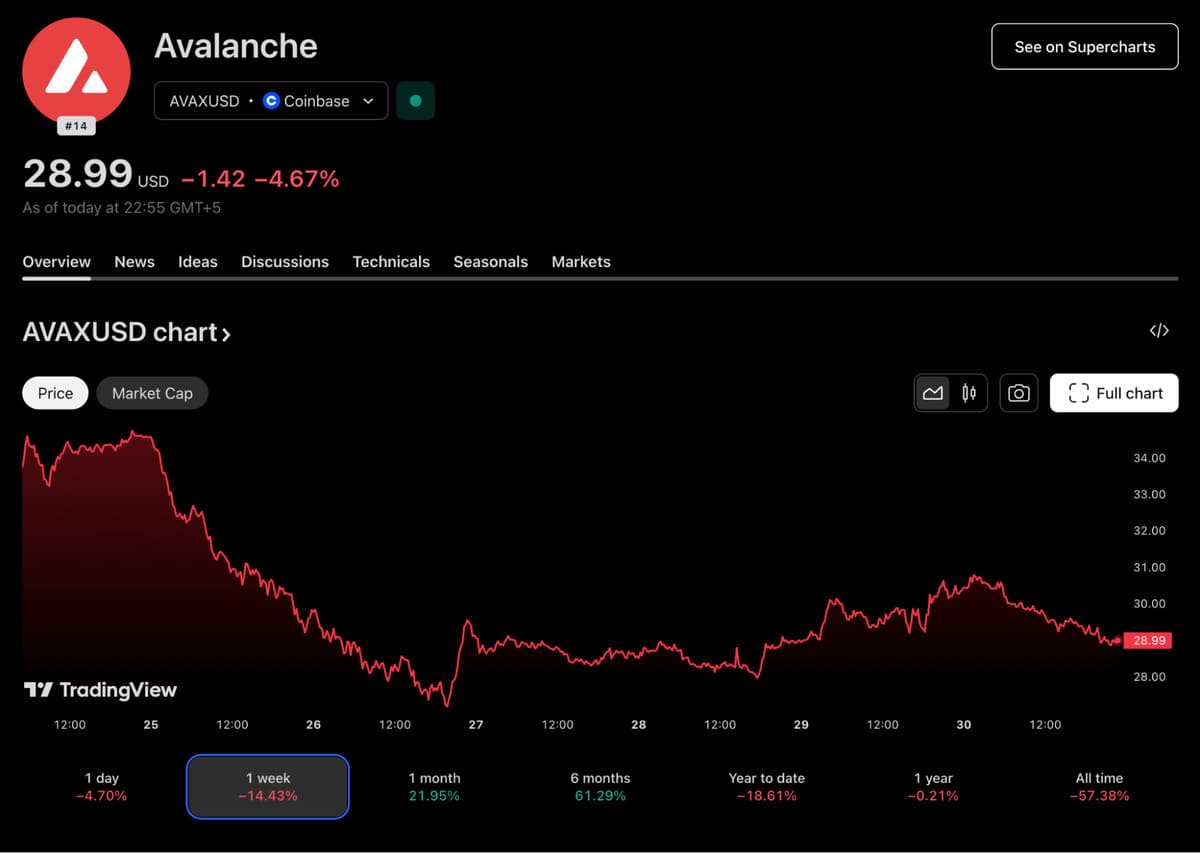 Avalanche (AVAX) can’t seem to catch a break lately. AVAX pushed past $34 last week, only to tumble 17% back to under $30. Even with Ava Labs partnering with giants like Mirae Asset Global Investments, Avalanche appears to be stuck and has yet to recover from the wider market slump.