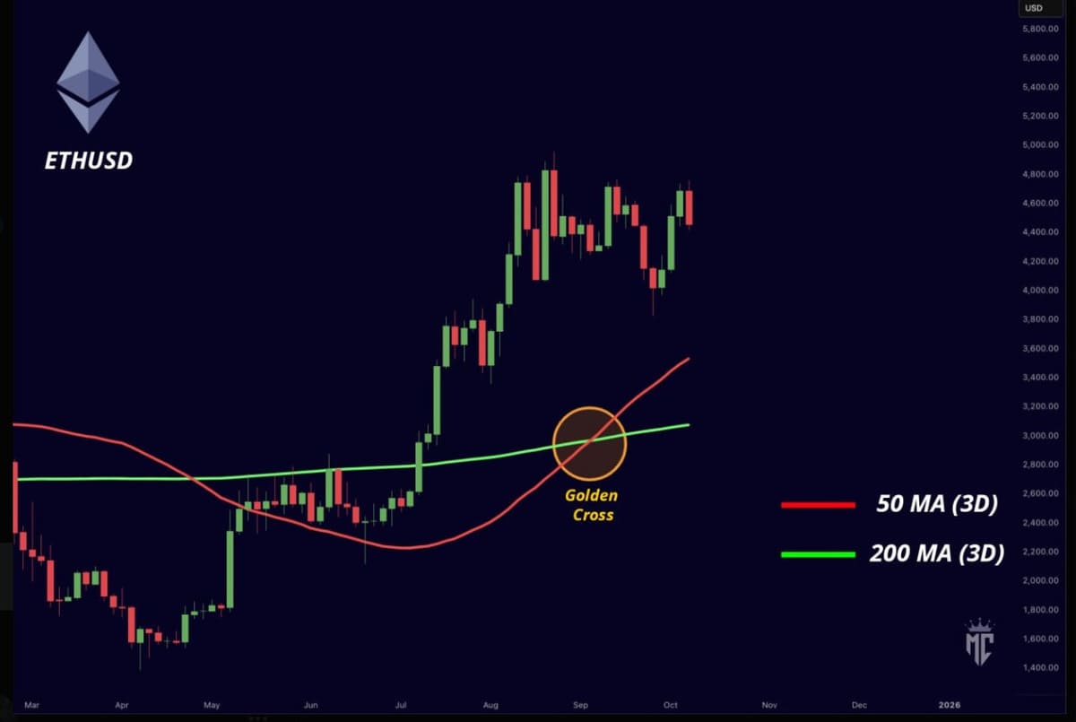 Ethereum (ETH) is gaining fresh hopes as a golden cross, a bullish indicator when the 50-day moving average rises over a 200-day, attests to a long-term upward trend. Strong market confidence and fundamentals are keeping the price steady at about $4,400. According to analysts, this arrangement is similar to the initial phases of previous rallies that have given way to significant price soars.