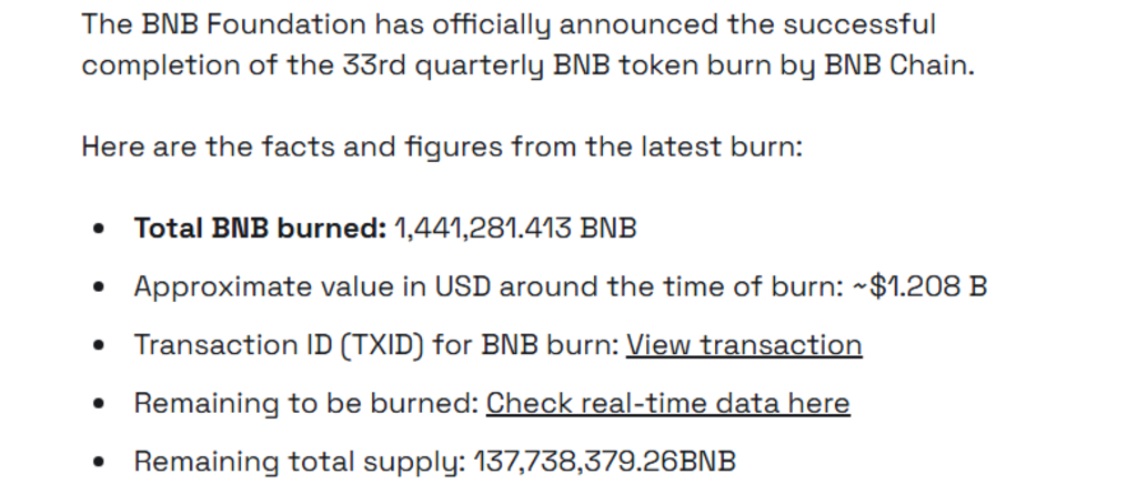 The 33rd quarterly auto-burn in BNB Chain was just finalized. The project eliminated 1,441,281 BNB tokens, which were valued at around $1.208 billion. This substantial reduction in supply makes the total BNB supply near its 100-million limit and makes it scarcer, particularly as the network implements major upgrades like Lorentz and Maxwell. Such advance precautionary devaluation actions reinforce token value among those who hold it and point to strong network fundamentals.