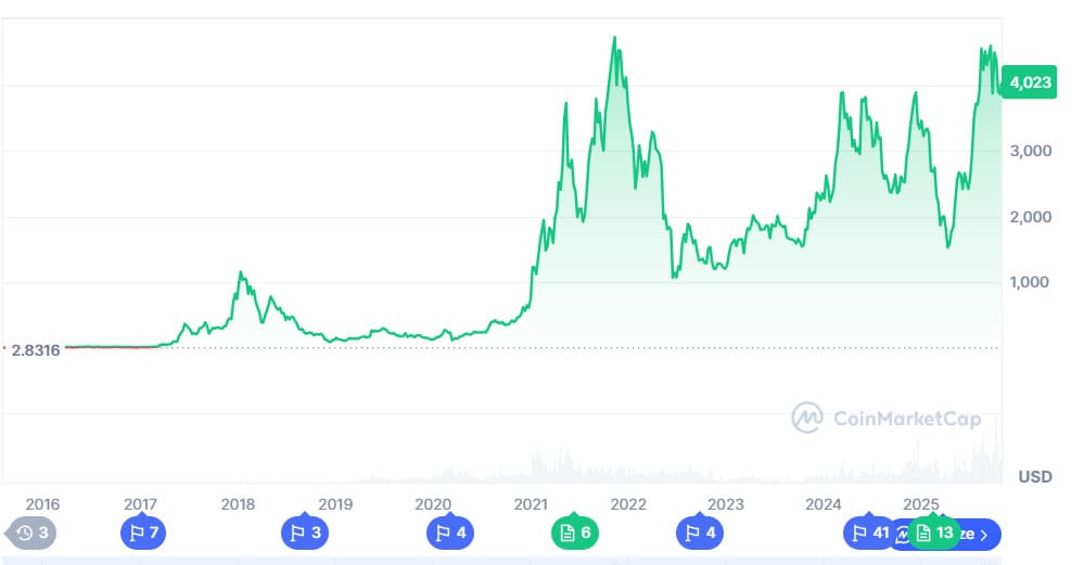 Currently, Ethereum trades at $4,023, up by 4.16% in the past week (at the time of writing). The price also represents an impressive 53.94% rise on an annual level. Regardless of the recent market volatility, Ethereum’s ability to maintain higher lows indicates increasing trader confidence as it gets closer to a potential breakout.