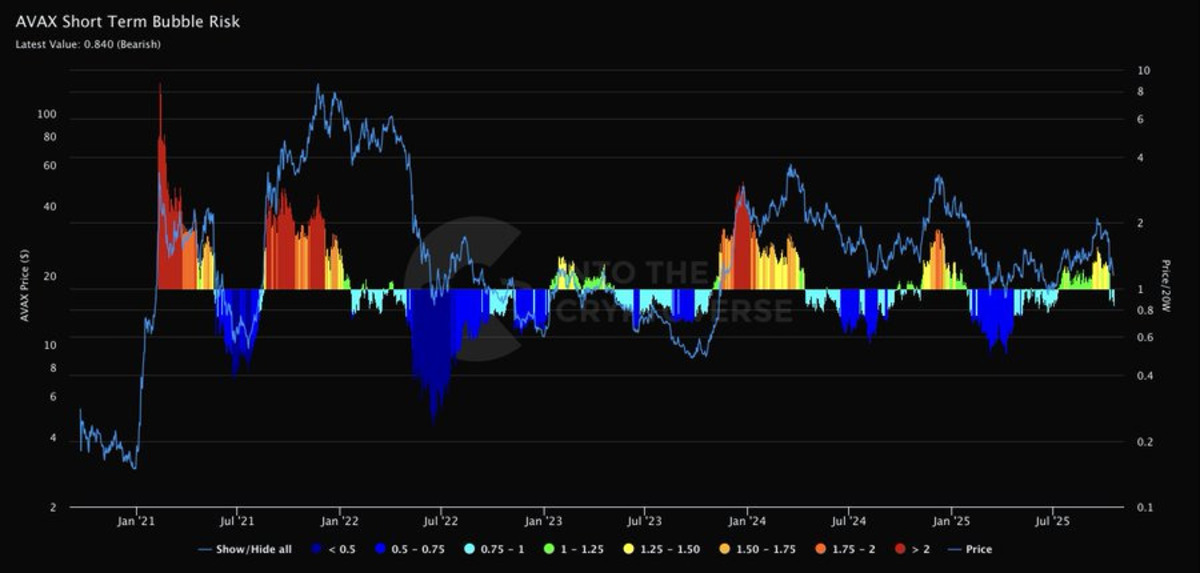 After a prolonged correction phase, Avalanche (AVAX) is holding up well near the $19-$20 support zone. Bullish move and cooling tendencies suggest AVAX could be setting up for a recovery. Analysts say its short-term bubble risk indicator shifted into neutral after several overheated months, a common sight leading up to new accumulation cycles.