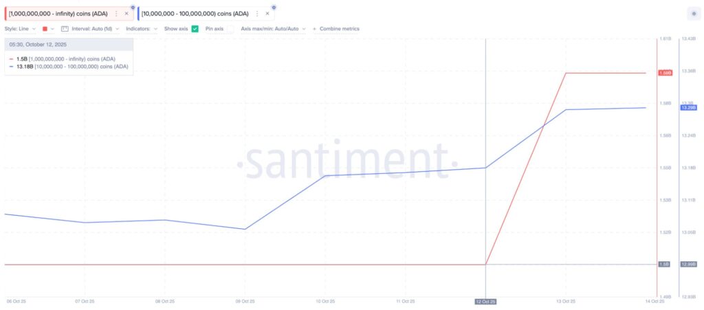 Cardano showed resilience after the recent “Black Friday” crash. On-chain data from Santiment reveal that wallets holding between 10 million and 100 million ADA increased their balances from 13.18 billion to 13.29 billion ADA. At the same time, mega-whales holding over 1 billion ADA raised their balances from 1.50 billion to 1.59 billion.