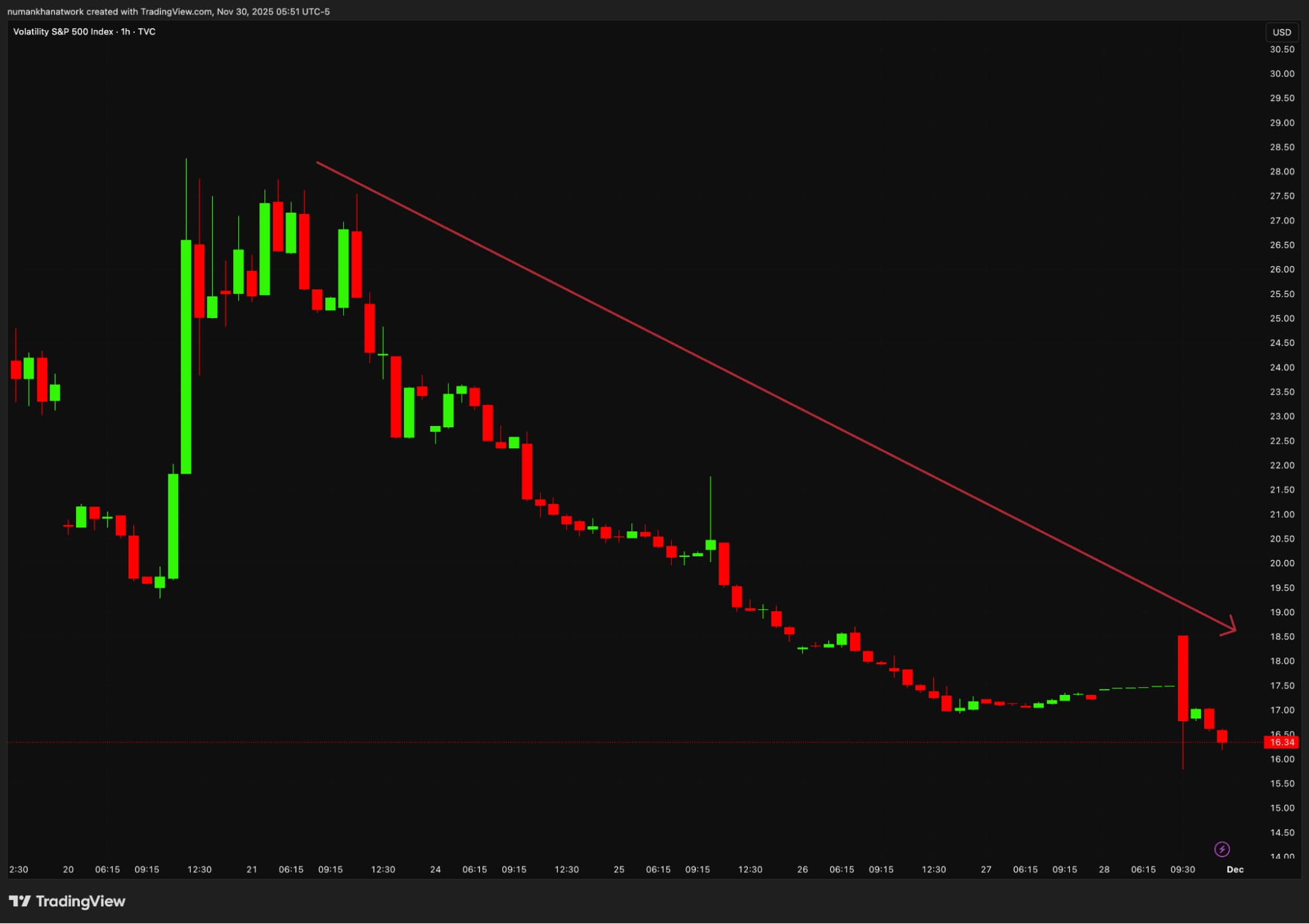 Bitcoin and the S&P 500 have just entered breakout mode. Volatility is cooling fast across both markets. Bitcoin’s BVIV has dropped back to 50% and the S&P 500’s VIX has eased to 16%. And that’s a clear sign that fear is fading and bulls are taking the wheel heading into December.