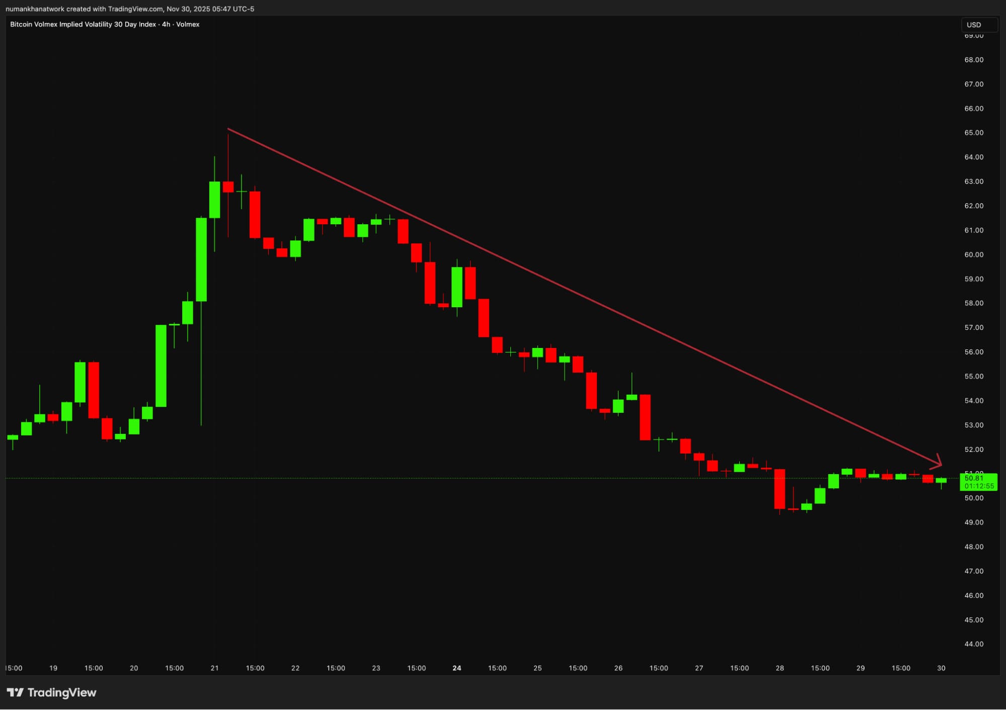 The latest volatility data makes one thing clear: the market is warming up again. The Bitcoin Volmex Implied Volatility 30 Day Index (BVIV), which spiked to nearly 65% just days ago, has cooled back to 50%.