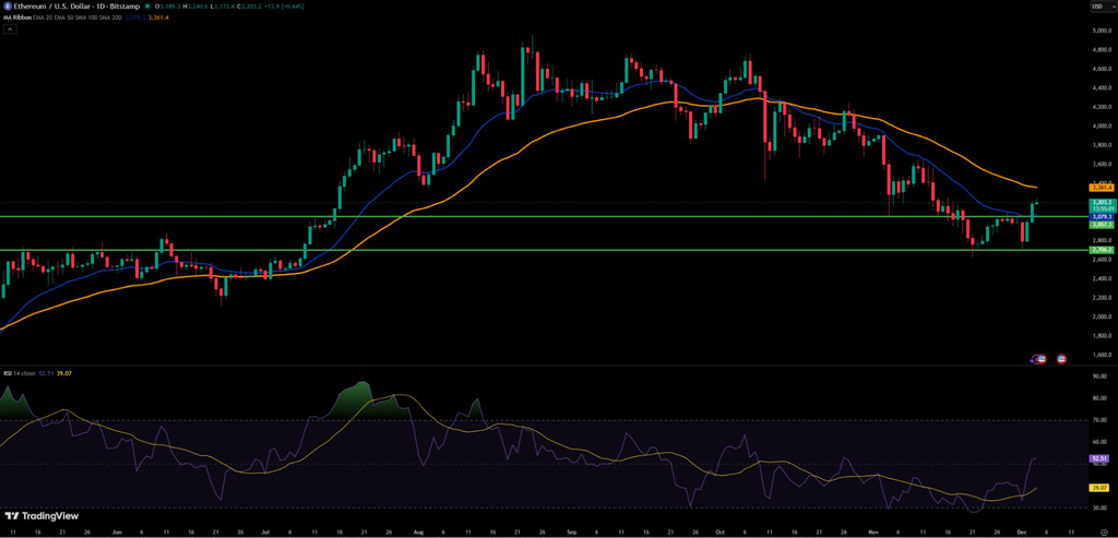 The daily chart shows a tug-of-war between early recovery signals and lingering overhead pressure. Price trades above the 20-day EMA but is still under the 50-day EMA, creating a narrow band that reflects short-term indecision. Support levels at $3,057 and $2,700 remain critical, especially as RSI hovers around the neutral zone.