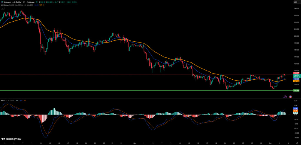 A golden cross between the 20-day EMA and 50-day EMA has occurred on Solana’s 4-hour price chart. After forming a double bottom around $121, Solana has rallied to $140, and holders are hoping that it breaks above this resistance. On-chain accumulation continues to absorb supply despite Alameda-related unlocks increasing selling pressure.