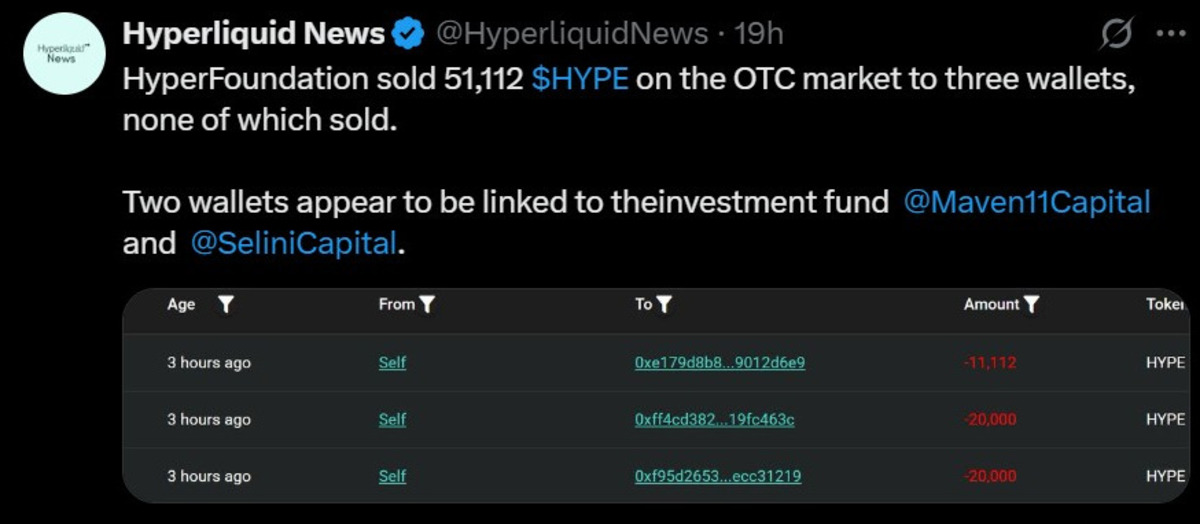 The Hyper Foundation’s recent OTC sale of 51,000 HYPE tokens for $1.73 million highlights the continuous growth of the ecosystem. On-chain records indicate that transparent transfers have been made from the foundation’s treasury wallet to OTC buyers, which brings total cumulative sales to around $11.6 million. These types of deals are structured to finance operations without causing market imbalance, representing a controlled liquidity management rather than a bearish condition.