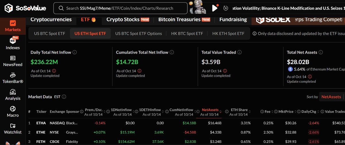 This week, Ethereum showed its superiority, recording an increase of 4.2% to trade at $4,154. The recovery is accompanied by good inflows into ETFs and technical strength at key support levels. Spot ETH ETFs have recorded a net inflow of $236.2 million as a drastic reversal of the outflows recorded last week. Fidelity’s FETH was first in the rush, and total assets in Ethereum ETFs currently stand at over $28 billion, a fact that demonstrates ETH as an institutional favorite.