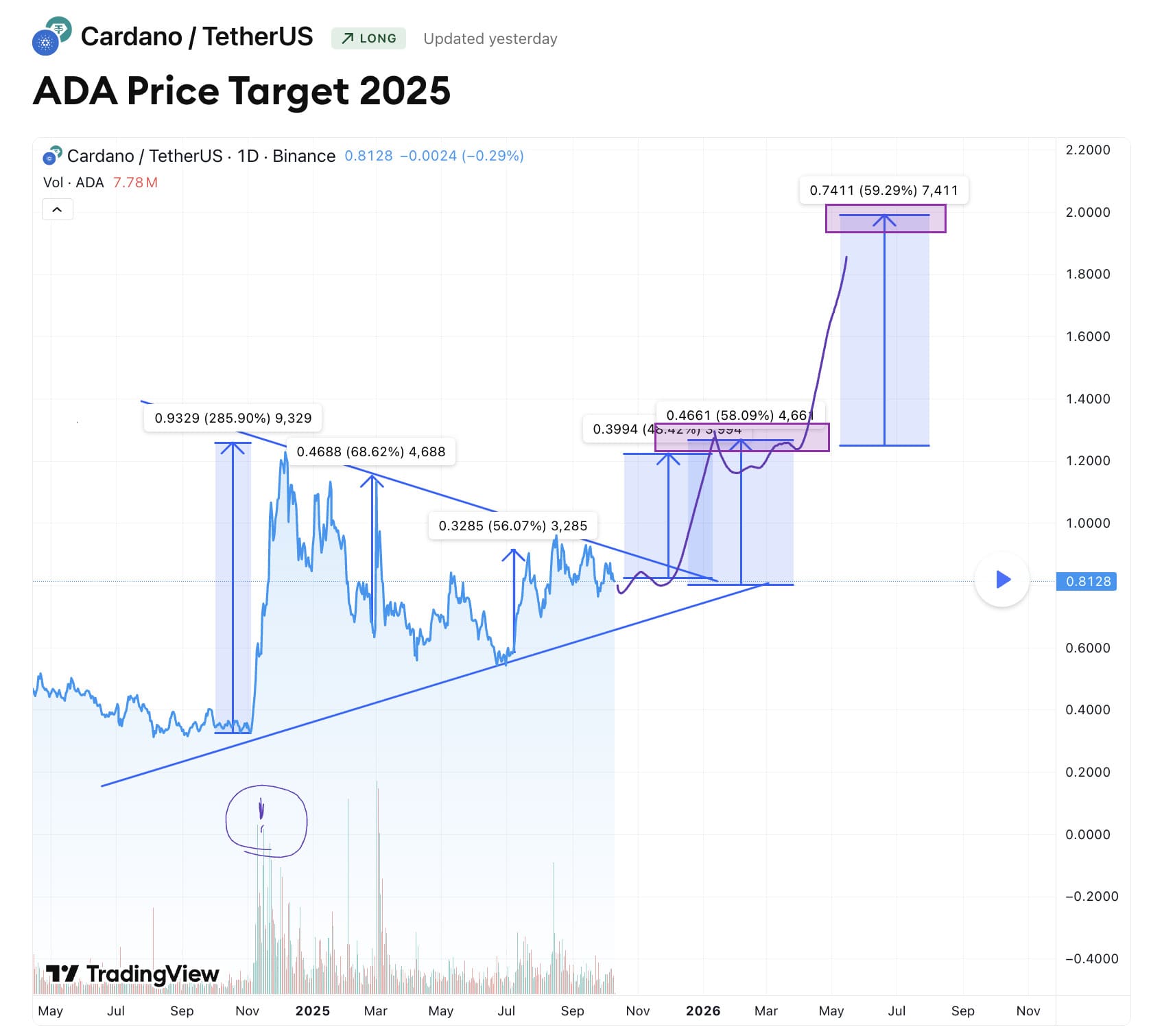 He projects ADA could climb toward $1.20, and possibly $2, if sentiment improves and no new global shocks hit the market. Despite macro tension between the U.S. and China, ADAās steady structure suggests traders are accumulating rather than fleeing.