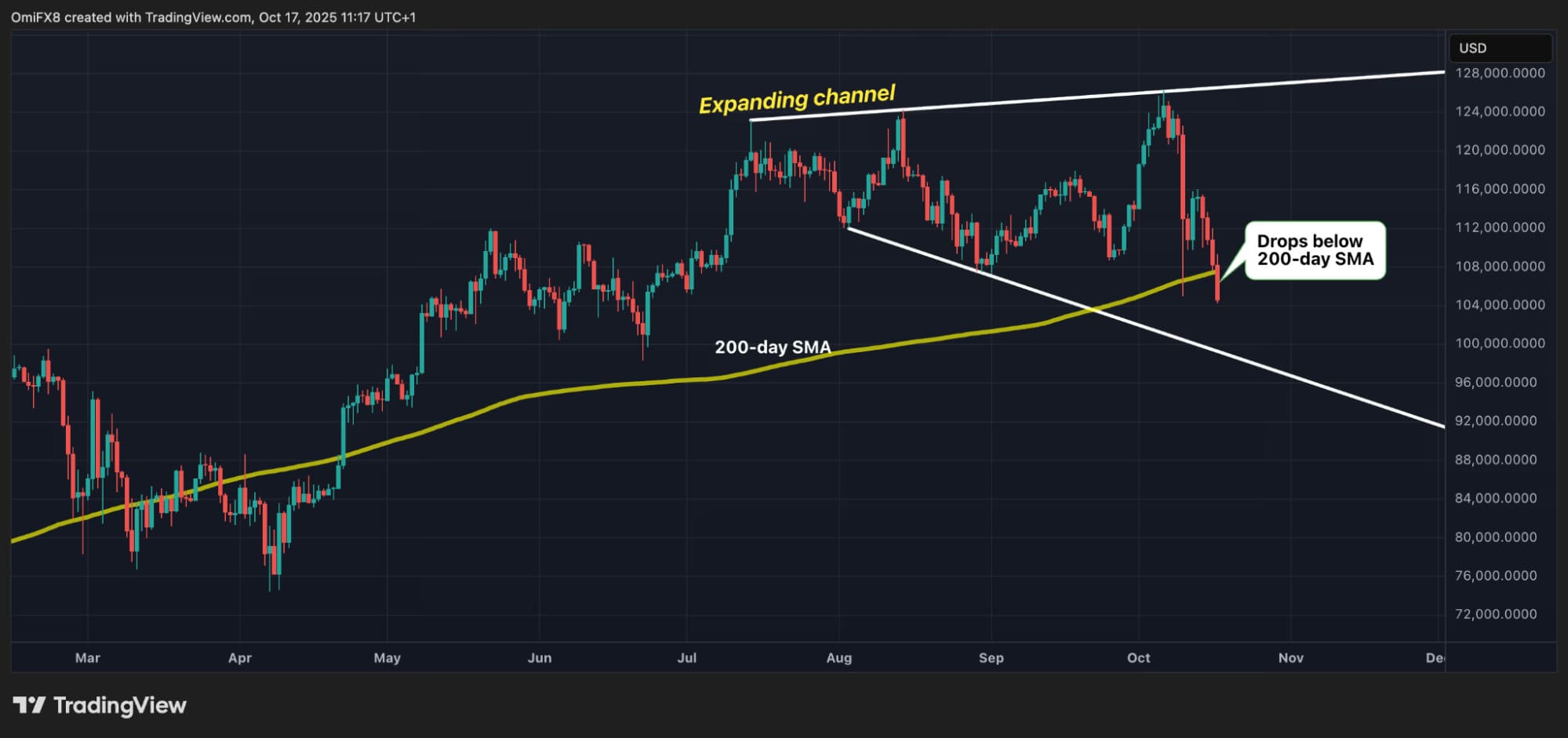 Bitcoin has continued its downtrend below $110,000, with prices now around the critical $108,000 mark. The fall confirms a break below the 200-day simple moving average that signals sustained selling pressure. Analysts warn that if the coin fails to hold above $101,000, the next level of support is between $99,500 and $98,000.