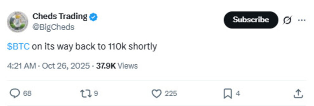On X, analysts stay slightly ominous about Bitcoin’s future, with one even indicating that a short-term pullback to $110,000 may be on the way.