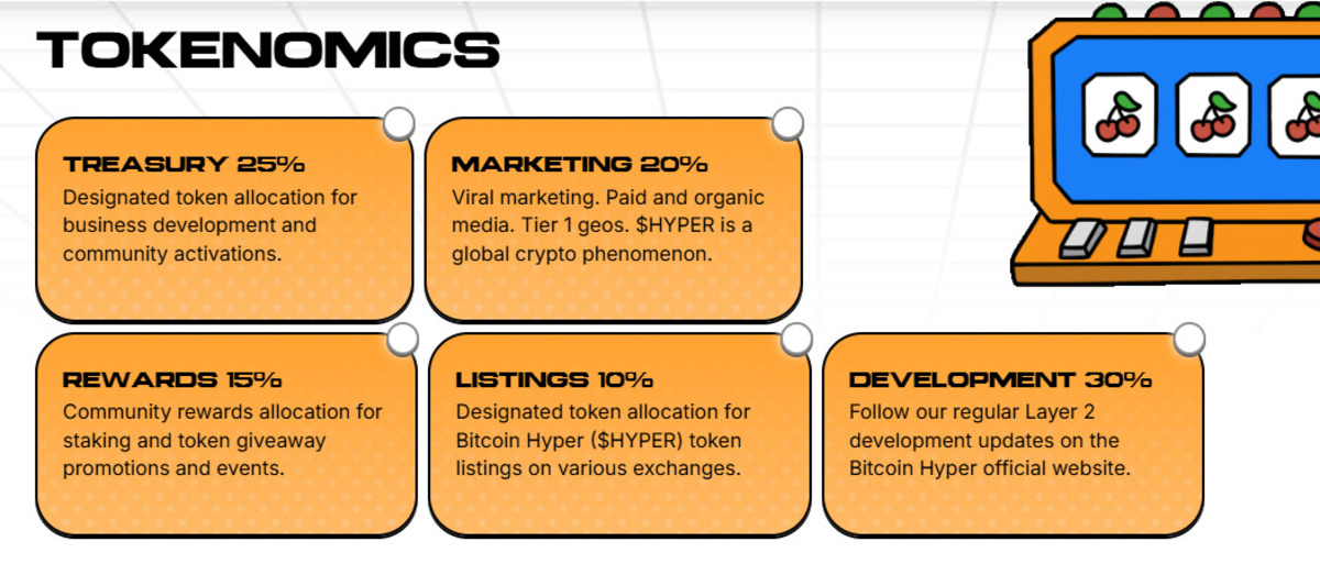 Where Bitcoin stands still, builders move fast. With BTC Hyper, developers can use Solana SDKs and Rust to create high-performance decentralized applications, anchored to BTC’s base layer for enhanced trust and security. The total token supply is distributed well among the marketing (20%), listings (10%), treasury (25%), development (30%), and rewards (15%).