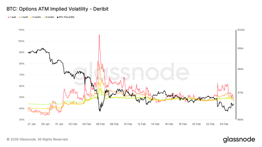 When Bitcoin approached $62,000 in recent sessions, one-week implied volatility jumped from 47% to 62% as participants rushed to buy short-term protection. When price recovered to $65,000, volatility compressed back to 47% within days.