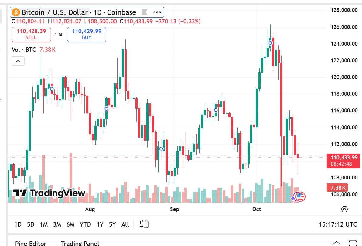 Bitcoin is now worth $110,428.39, which is a drop of 0.21% in the last 24 hours. It has a market cap of $2.22 trillion and trades of $73.39 billion per day, which is a drop of 10.35%. Irrespective of that, BTC remains the top-performing cryptocurrency in the year to date, still holding the top spot on centralized exchanges and decentralized exchanges.