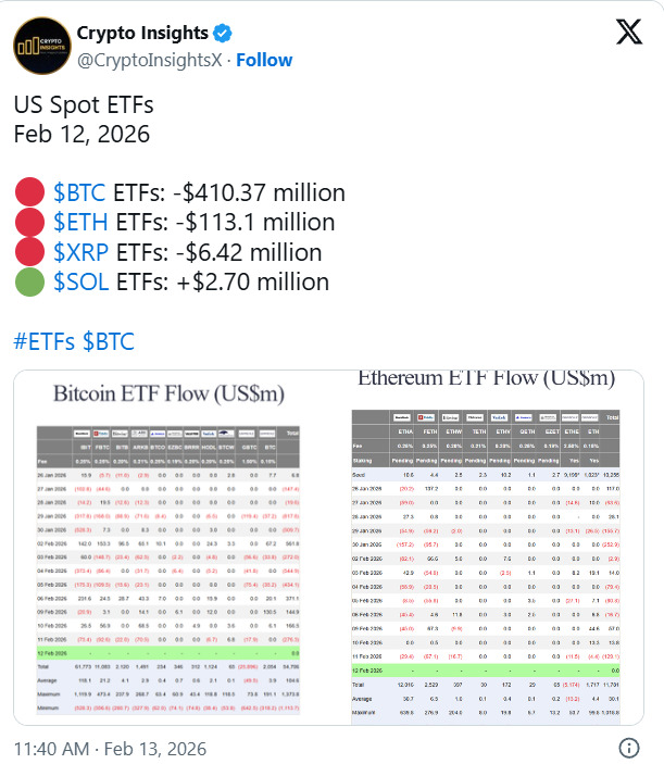 A recent report by Crypto Insights indicated that U.S. spot Bitcoin ETFs recorded net outflows of $410.37 million. This price action represents the continuation of a larger trend of risk reduction among major digital asset funds. Similarly, Ethereum ETFs registered outflows of $113.1 million, while XRP experienced smaller outflows of $6.42 million. Solana was a notable exception to this trend, registering a small inflow of $2.7 million, diverging from the overall market sentiment.