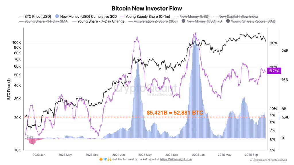 Over the last 30 days, Bitcoin has seen one of its strongest capital inflows of the year. Analyst Axel Adler Jr reports that more than $5.4 billion of new money has entered the crypto market, equal to roughly 52,000 BTC bought in a single month. That is a serious vote of confidence, and it matters for any medium-term Bitcoin price prediction.