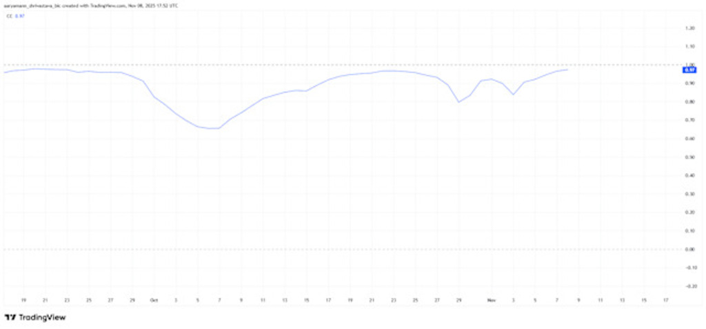 After weeks of uneven trading, Bitcoin (BTC) is once again taking the lead across the crypto market. But its influence on Solana (SOL) is drawing renewed attention from analysts. The two assets now share one of the tightest trading correlations seen in recent years, with data from TradingView showing a 0.97 correlation score between them.