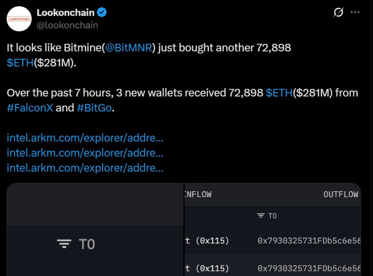 Ethereum remains above $3,800, continuing its rebound as institutional demand picks up. Bitmine apparently grew its Ethereum treasury by adding more than $281 million through various wallet transactions associated with FalconX and BitGo. Bitmine’s strategic accumulation comes after previous purchases of $417 million, making it one of the largest corporate holders of Ethereum.
