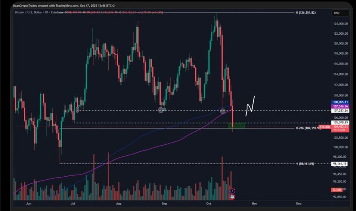 According to information shared by Daan Crypto Trades, Bitcoin is now testing the 0.786 Fibonacci retracement level at around $104,000. Historically, the region has been a critical support zone. Holding this level may see a short-term rebound towards the $110,000-$115,000 range. Conversely, losing it may open the way for deeper retracements to around $98,000 for BTC.