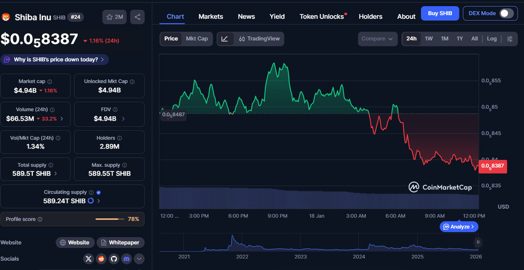 The Shiba Inu coin price is currently trading near $0.0000085. Recent community-led token burns and the movement of coins off exchanges indicate ongoing holder activity. While these factors affect token supply, SHIB remains sensitive to general market trends and Bitcoin price movements.