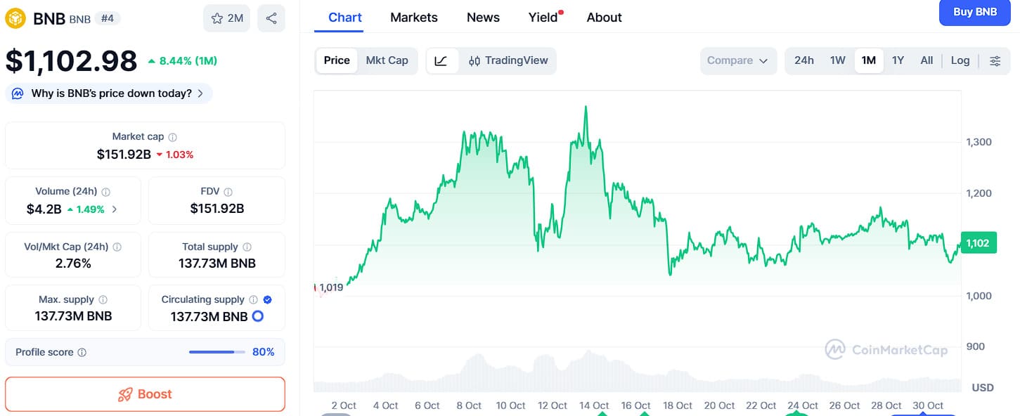 Key resistance levels are forming near $1,165, $1,200, and $1,245, while support sits at $1,040, $985, and $920. These levels indicate that BNB is consolidating within a strong uptrend, with the potential to break into a new price discovery zone above $1,200.