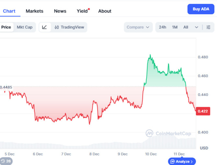 At the time of writing, Cardano is quoted at $0.424, with a 24-hour trading volume of $1151924068.28. Recent price movement shows a 6.02% decrease over the last 7 days. Price action can be influenced by broader market conditions, macroeconomic news, large-holder activity, and shifts in risk appetite.