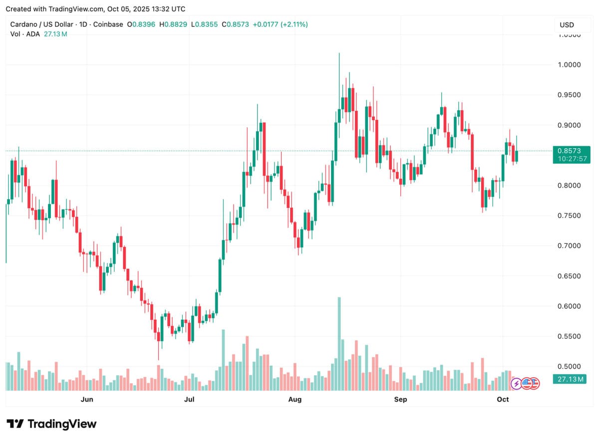 Cardano price is currently $0.8573. Investors are closely watching ADA as the crypto market heads into Q4 2025. The price of Cardano is being affected by a number of factors such as regulatory developments, technical resistance levels and whale activities.Ā
