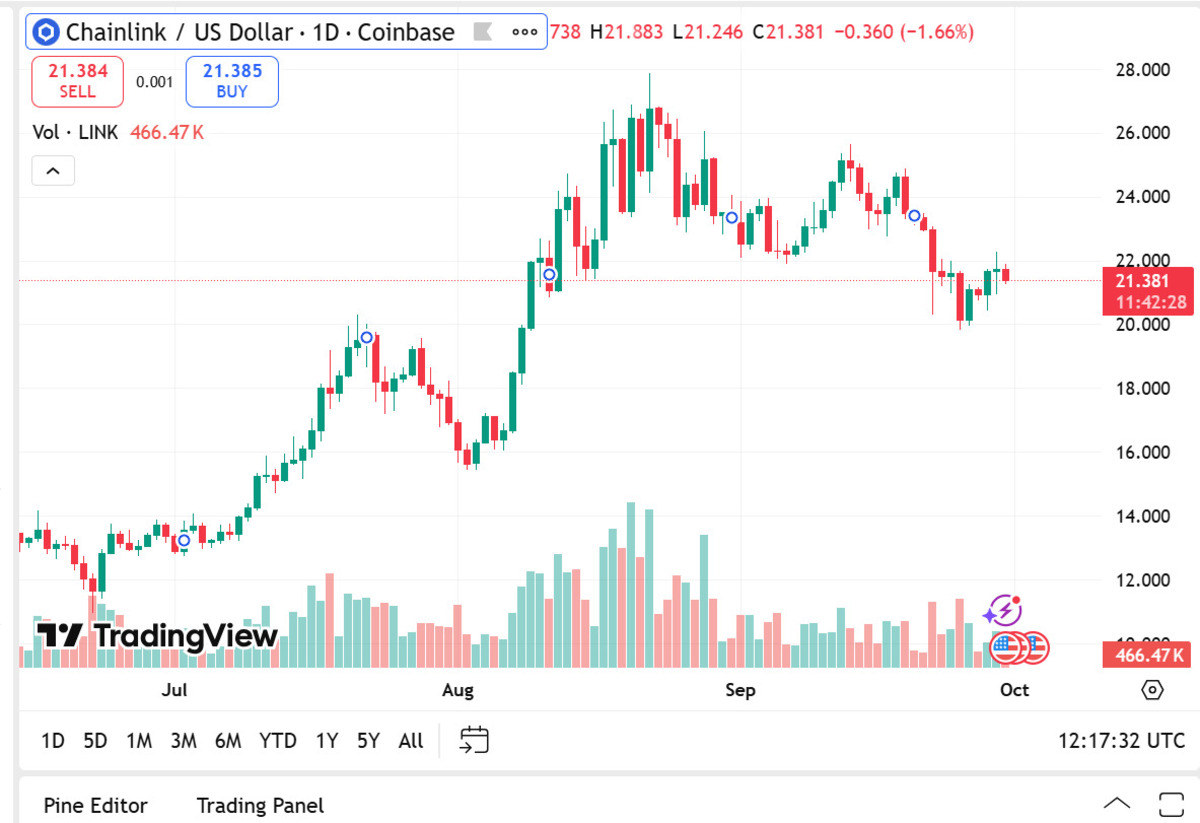 Chainlink Price is at $21.38, up 1.28% over the last 24 hours with a market capitalization of $14.5 billion and trading volume of $736.49 million, which is up 35.67%. This stability reflects growing confidence in decentralized oracle solutions with DeFi projects using Chainlink for reliable off-chain data.