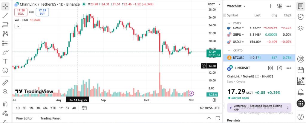 Chainlink currently trades at $17.28 with a market cap of around $12 billion and a 24-hour volume of around $503 million. That sets a solid base for any Chainlink Price Prediction push toward $20 and then $30 on stronger flows.