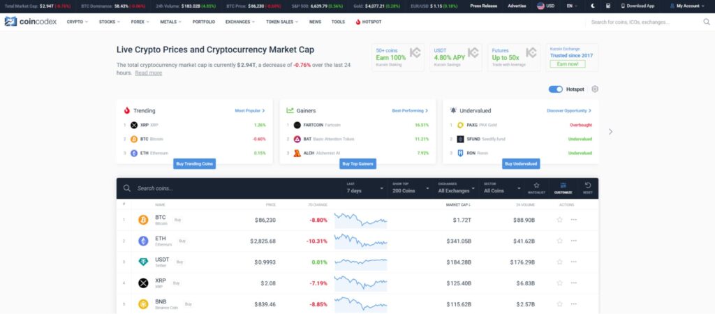 The CoinCodex frontpage offers a simple look into various assets.