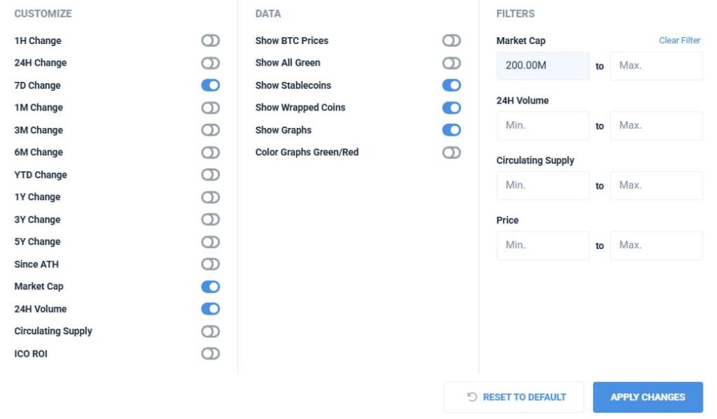 You can customize what assets are shown on the frontpage via CoinCodexās filters.