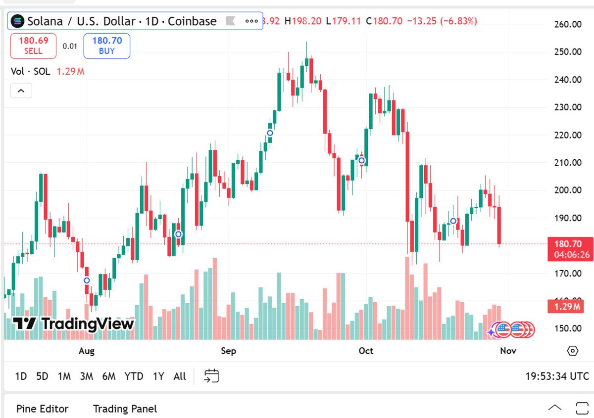 SOL continues to serve as the backbone for high-speed blockchain activity and has attracted both DeFi and NFT developers. At the moment, it sells at $180.62, a loss of 5.25% within the last 24 hours. Solana has a market capitalization of $101.89 billion and a trading volume of $9.6 billion, a rise of 32.69%.