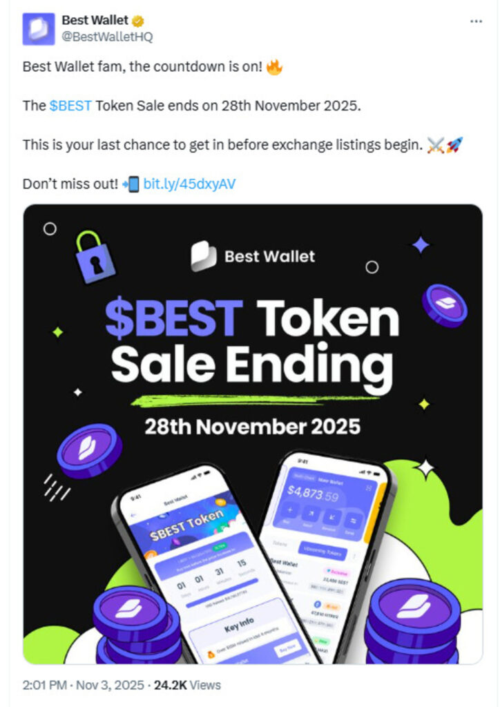 $BEST started its presale a year ago and has raised over $16.8 million to date. The following 23 days mark the final window to get the token before the Best Wallet presale concludes and the token gets listed on major platforms. Its current price is $0.025895. Prospective buyers can purchase the token by swapping USDT or ETH, or using a bank card.
