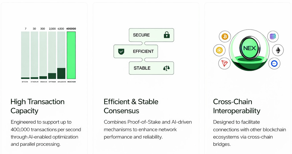 NexChain is designed as an AI-optimized layer-1 blockchain, emphasizing performance, scalability, and transaction efficiency. The platform combines a proof-of-stake consensus model with AI-based network optimization tools. It reports high throughput capabilities and low transaction fees, positioning itself as infrastructure rather than an application-layer solution.